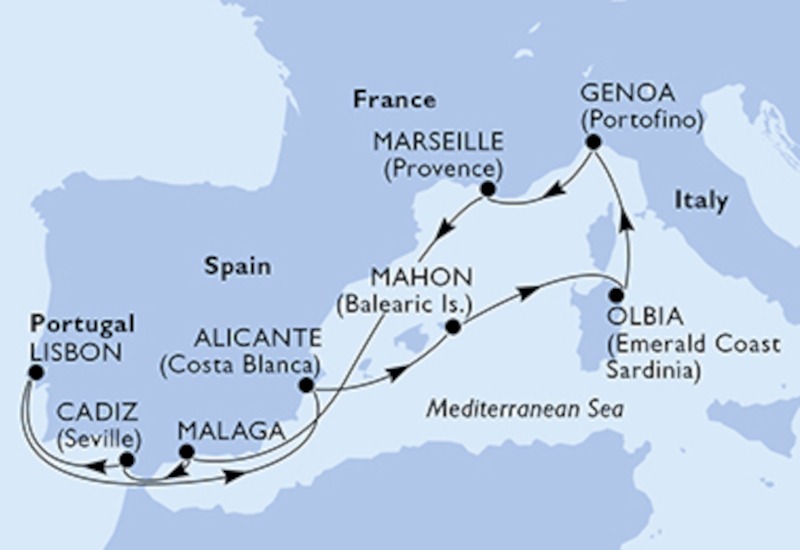 ITINERÁRIO – Lisboa, Alicante, Mahón (Menorca), Olbia (Sardenha), Génova, Marselha, Málaga, Cádis, Lisboa