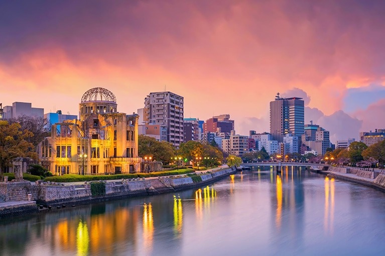 Pequeno-almoço no hotel. Em horário a combinar localmente, transfer até à estação Shin-Osaka para embarque no comboio de alta velocidade com destino a Hiroshima. Passeio pelos principais pontos da cidade como o Parque Memorial da Paz e a Cúpula da Bomba Atómica. Continuação para embarque no ferry com destino à ilha de Miyajima para visita ao Santuário Itsukushima, classificado como Património Mundial da UNESCO e famoso pelo Torii Flutuante, que parece flutuar na água durante a maré alta. Almoço entre visitas. Jantar. Alojamento em Hotel 4*.